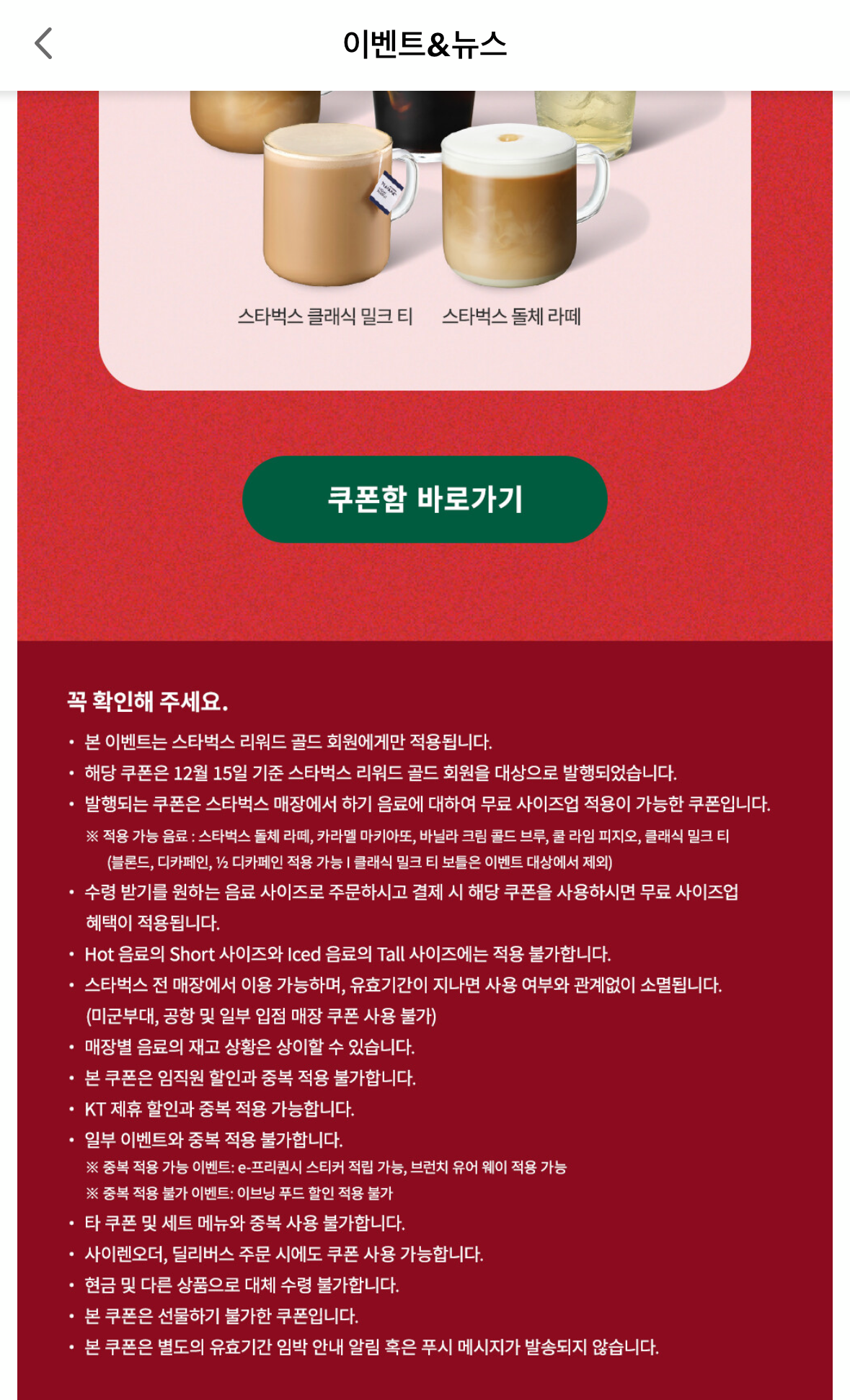 - 내용: 스타벅스 매장에서 무료 사이즈업 적용 가능한 쿠폰 증정
