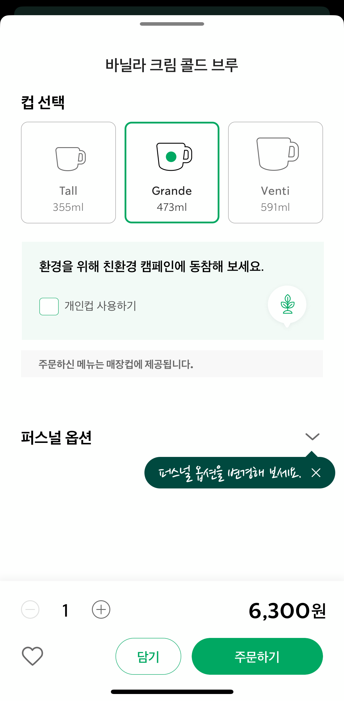 음료의 제일 작은 사이즈인 Hot의 Short과 Iced의 Tall 사이즈에는 적용이 불가합니다.
