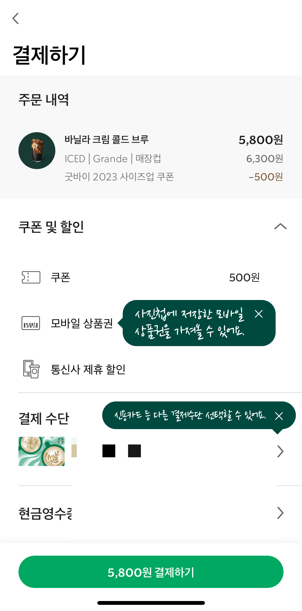 주문할 매장 선택- 행사 음료 선택(5가지)- 사이즈 선택- 주문하기- 결제하기- 쿠폰 및 할인에서 쿠폰- 굿바이 2023 사이즈업 쿠폰 선택- 자동 500원 할인