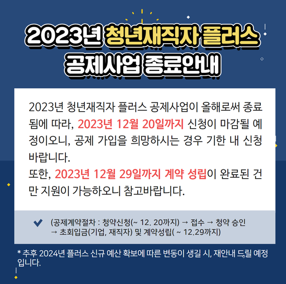 그 중 정부에서 청년재직자 플러스 상품의 공제사업 종료를 안내했습니다. 2023년을 마지막으로 사업이 종료됨에따라 2023년 12월 29일까지 계약 성립이 완료된 건에 한해서만 지원이 가능하다고 합니다.