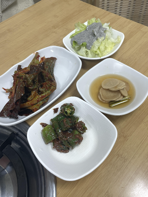 밑반찬으로 나온 흑임자 드레싱 샐러드, 상추무침, 고추무침, 무장아찌.