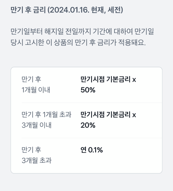 - 중도해지 금리 : 1개월 미만 연 0.1% 1개월 이상 3개월 미안 연 0.3% 3개월 이상 6개월 미만 가입시점 기본 금리 X 50% X 경과일 수 / 계약일수 (최저 연 0.3%)
