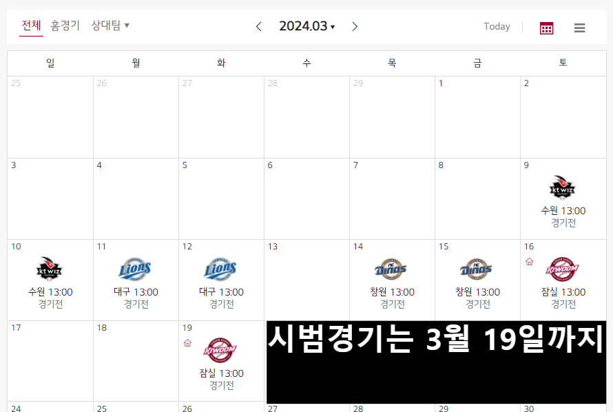2024년 KBO 각 구단별 시범경기 일정