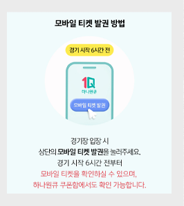하나원큐 앱에서 발권된 모바일 티켓은 경기 시작 6시간 전 하나원큐 앱 상단에 '모바일티켓 발권' 버튼이 활성화됩니다. 경기장 입장 시 해당 버튼을 통해 생성된 QR코드로 입장이 가능합니다.